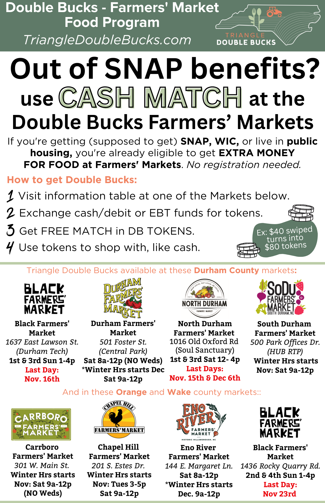 Participating Durham and Wake County Farmers’ Markets currenlty do not have a Double Bucks matching cap. Participating Orange County Farmers’ Markets have a $50 Double Bucks matching cap. Please verify with your local market, as this could change.